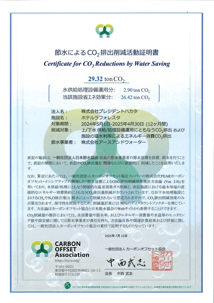 この度ホテル ラ フォレスタは、一般社団法人「カーボンオフセット協会」よりホテル館内での節水活動によるCO₂排出削減の証明書が交付されました。 日頃より当ホテルの環境への取り組みにご理解・ご協力を賜り、心より感謝申し上げます。 今後もホテル ラ フォレスタは、エコフレンドリーホテルとしてホテル運営を通じて環境負荷軽減に取り組んでまいります。